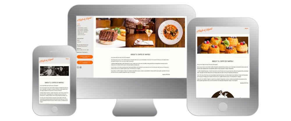 We are proud to launch the new website design for il Caffe di Napoli. Over the past few months our website designers have worked closely with the management of il Caffe di Napoli to produce a complete new website design. The new website was built on the back of a CMS system to allow the owners change the content of the website with ease and to make changes to menus into the future. The web design is fully responsive with a progressive layout that works across all devices like phones, tablets, laptops and desktops.